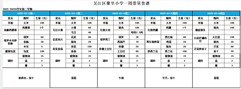 黎里小学3月带量食谱及原材料供货商公示
